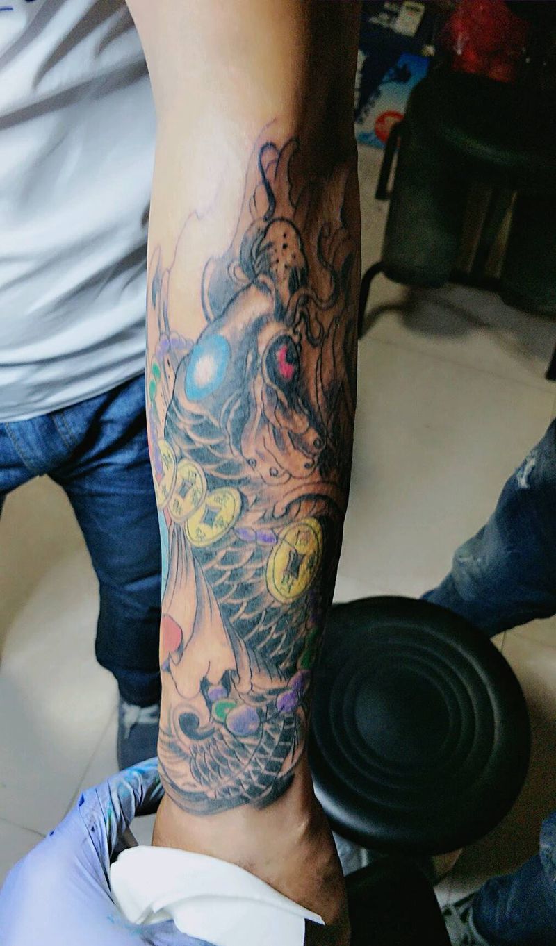 当前位置: 首页 >江苏省南京市纹身店-魔山刺青纹身图案>鲫鱼莲花纹身图片