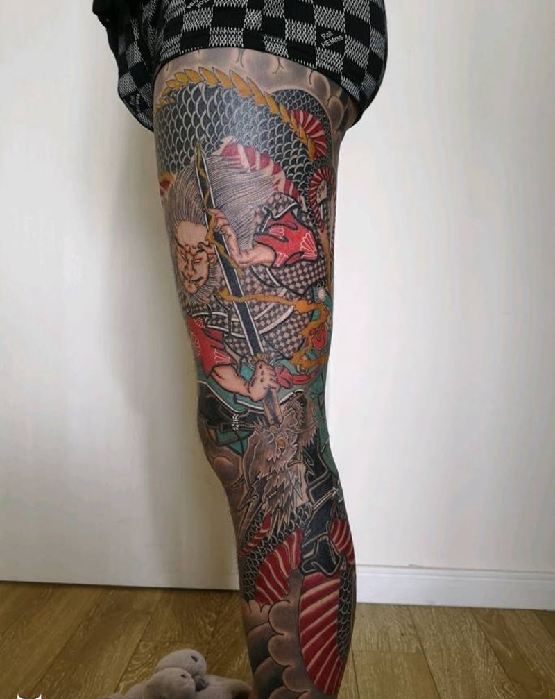 • T网红王老大花腿龙纹身图片_腿部新传统纹身图案