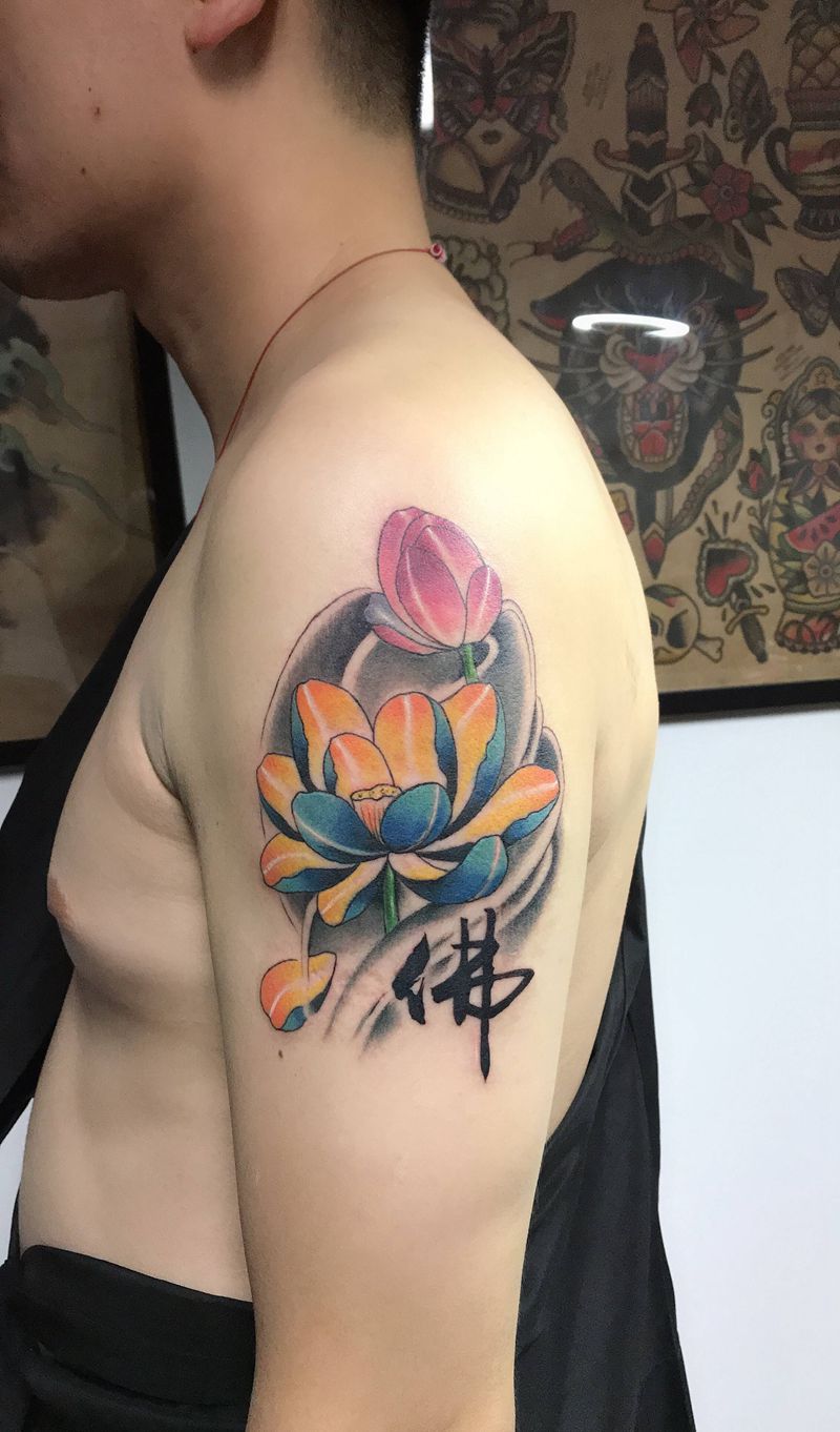 当前位置: 首页 >江苏省无锡市纹身店-迷刺青纹身图案>传统莲花纹身纹身图片_手臂新传统老传统莲花书法荷花纹身图案