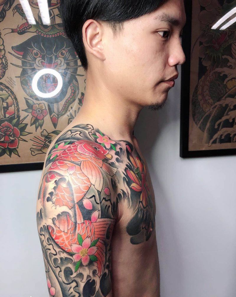 当前位置: 首页 >江苏省无锡市纹身店-迷刺青纹身图案>传统半甲纹身图片_胸部手臂新传统老传统鲤鱼半甲半胛纹身图案