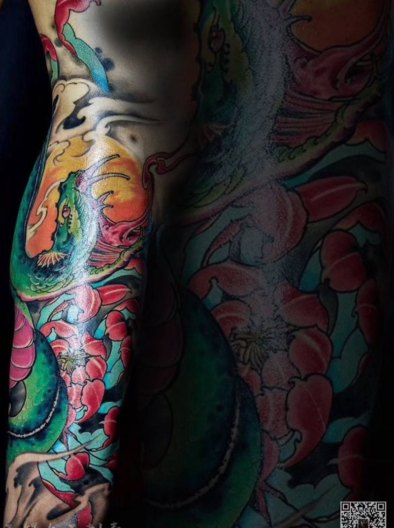 • T网红王老大花腿龙纹身图片_腿部新传统纹身图案