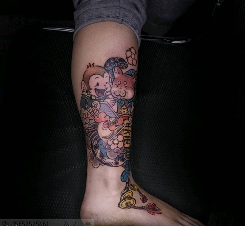 当前位置: 首页 >江苏省无锡市纹身店-青臣刺青纹身tattoo纹身图案>全家生肖纹身图片_腿部New School老传统生肖卡通女性纹身图案