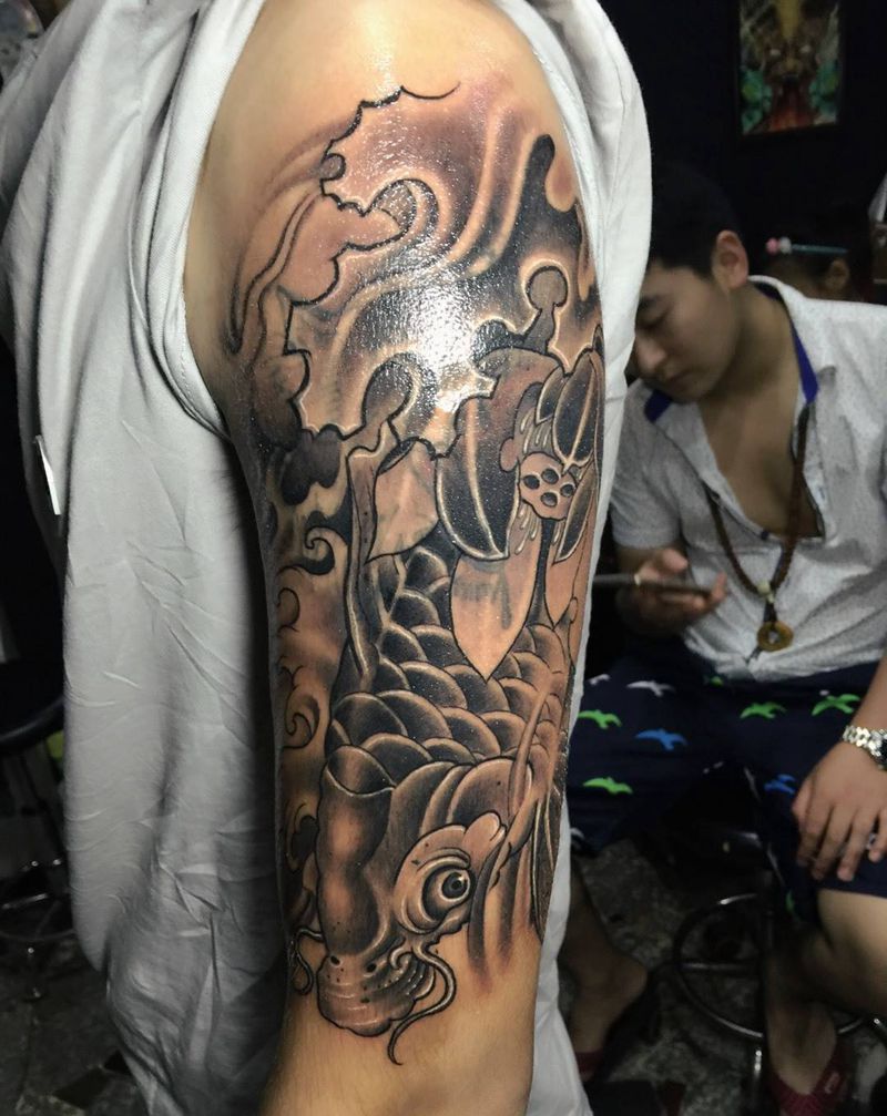 当前位置: 首页 >江苏省无锡市纹身店-林刺青纹身图案>黑灰鲤鱼遮盖狼头纹身图片