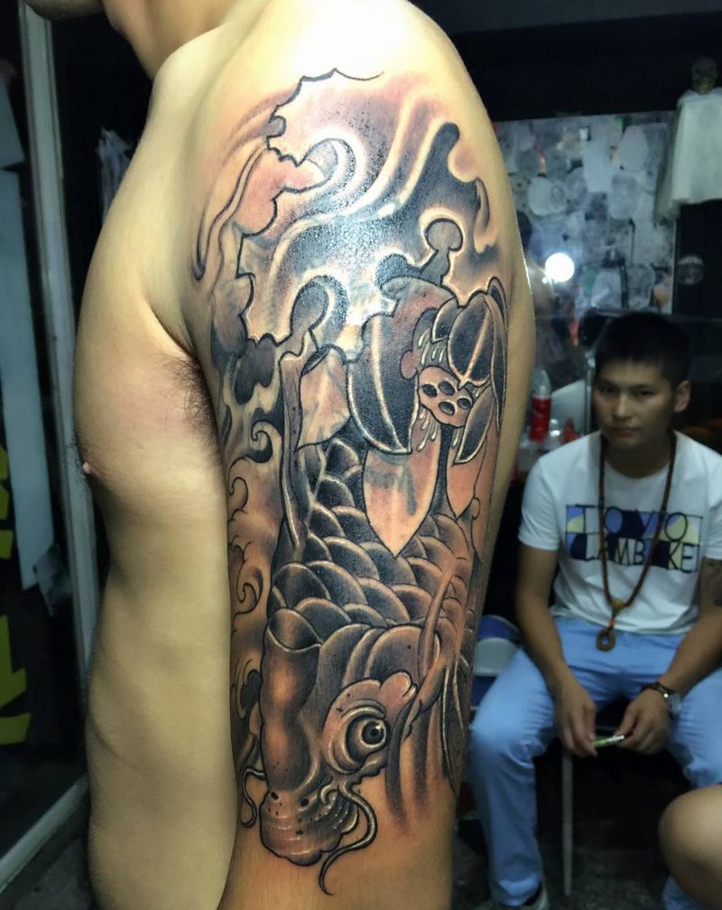 当前位置: 首页 >江苏省无锡市纹身店-林刺青纹身图案>黑灰鲤鱼遮盖狼头纹身图片