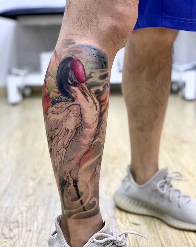 仙鹤纹身图片_腿部老传统纹身图案