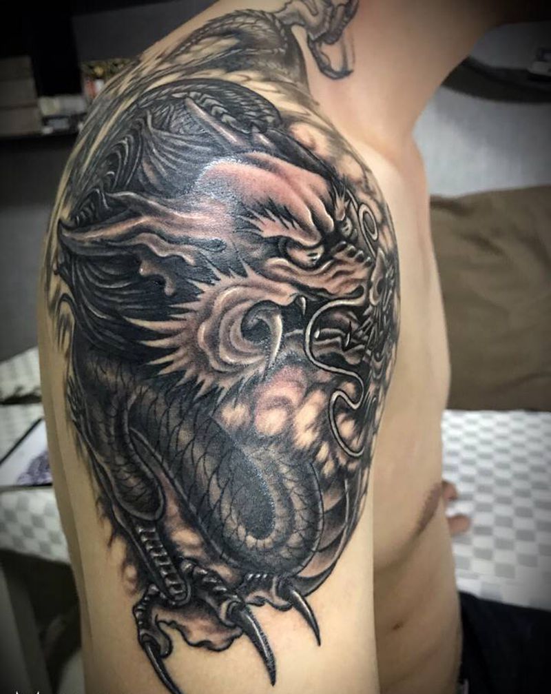 林刺青 披肩龙纹身图片_肩部手臂新传统纹身图案