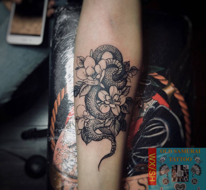 当前位置: 首页 >江苏省无锡市纹身店-Old Samurai Tattoo纹身图案>蛇与花纹身图片_手臂纹身图案