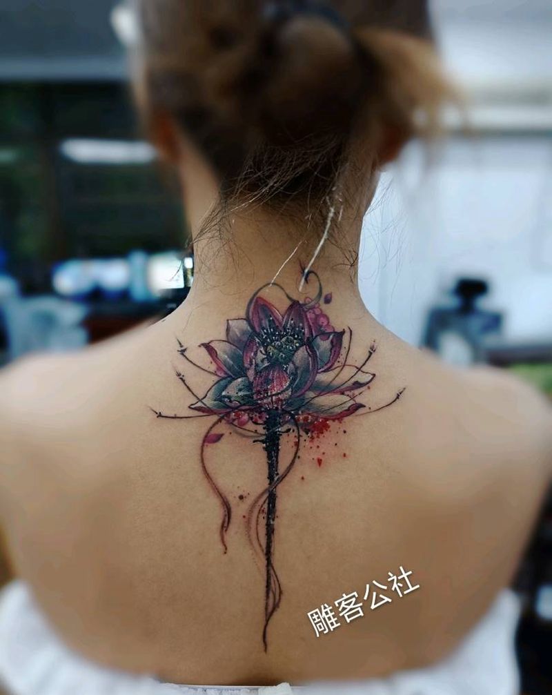 莲花遮盖纹身图片_颈部水彩纹身图案