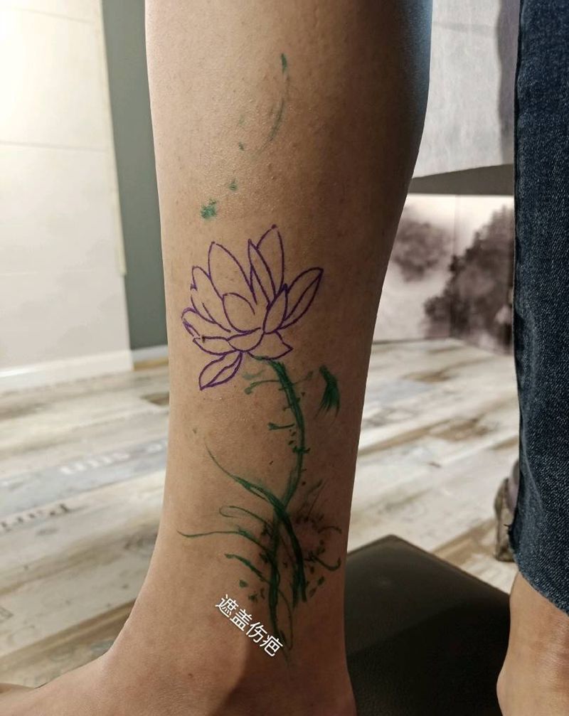 莲花盖疤纹身图片_腿部水彩纹身图案