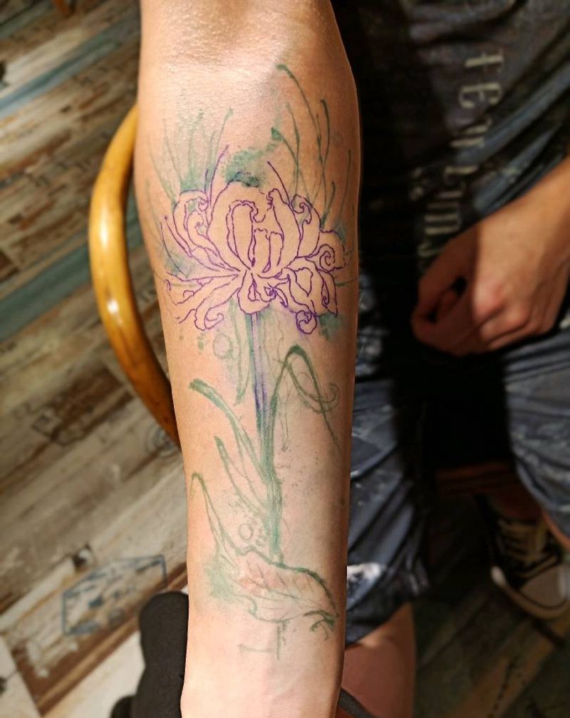 当前位置: 首页 >江苏省无锡市纹身店-无锡雕客公社纹身纹身图案>彼岸花纹身图片_手臂水彩纹身图案