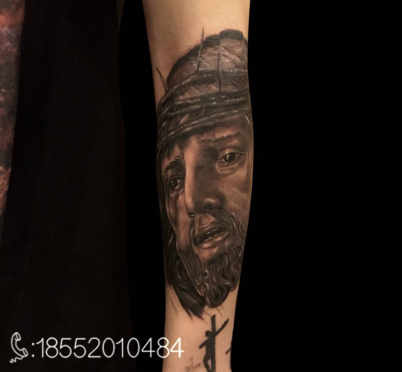 当前位置: 首页 >江苏省无锡市纹身店-睿刺青纹身图案>耶稣写实小臂纹身图片_手臂欧美写实纹身图案