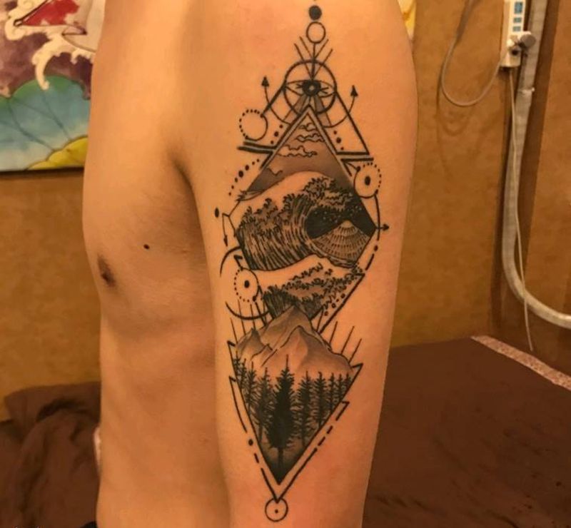 山与海恢复后纹身图片_几何点刺纹身图案