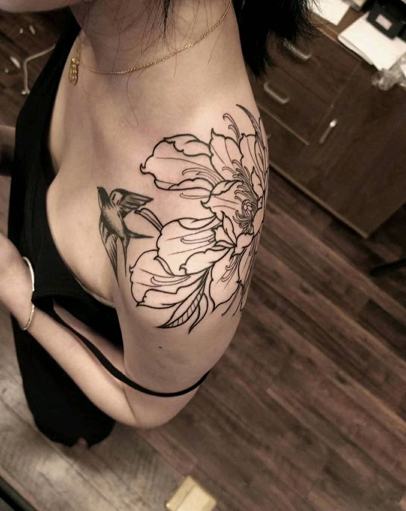 肩部牡丹纹身图片_肩部新传统水彩纹身图案
