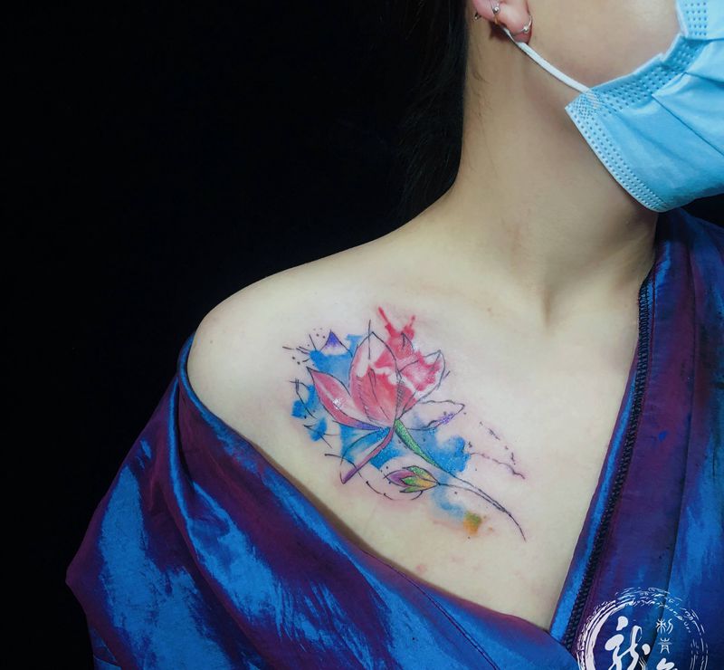 水彩荷花纹身图片_胸部水彩纹身图案