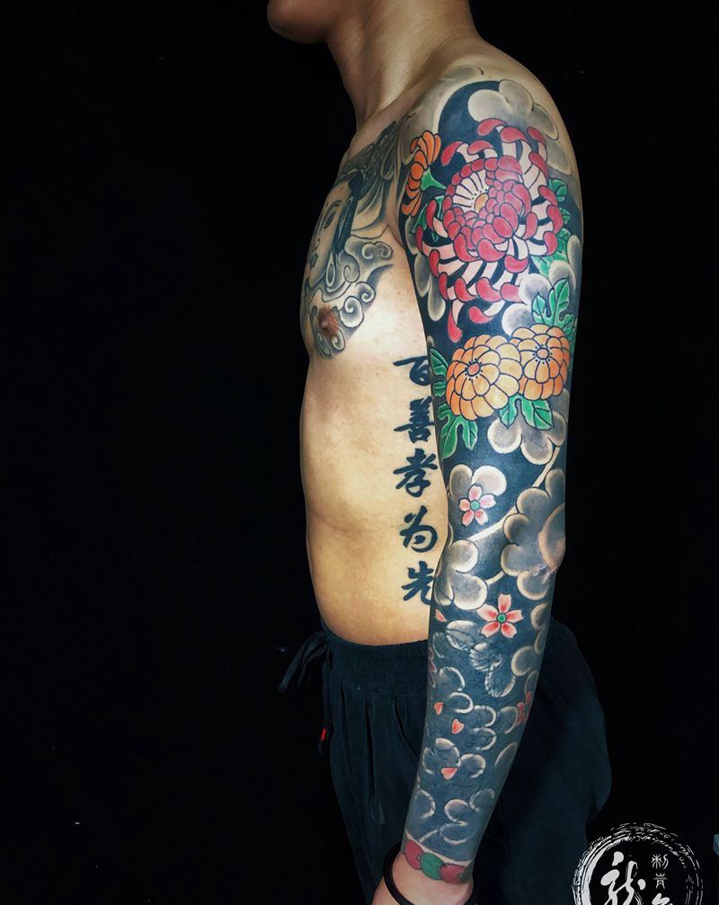 当前位置: 首页 >江苏省无锡市纹身店-无锡龙舞刺青纹身工作室纹身图案>双花臂纹身图片_手臂胸部老传统新传统纹身图案