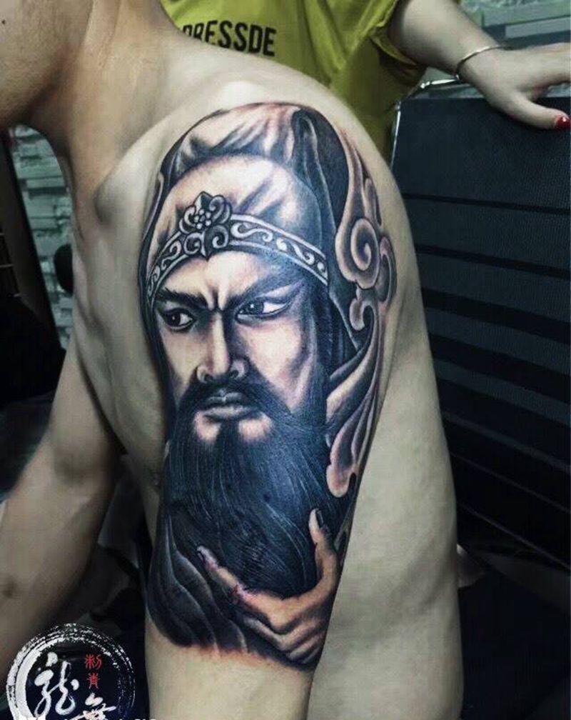 当前位置: 首页 >江苏省无锡市纹身店-无锡龙舞刺青纹身工作室纹身图案>关二爷纹身图片_成品手臂传统肖像人物纹身图案