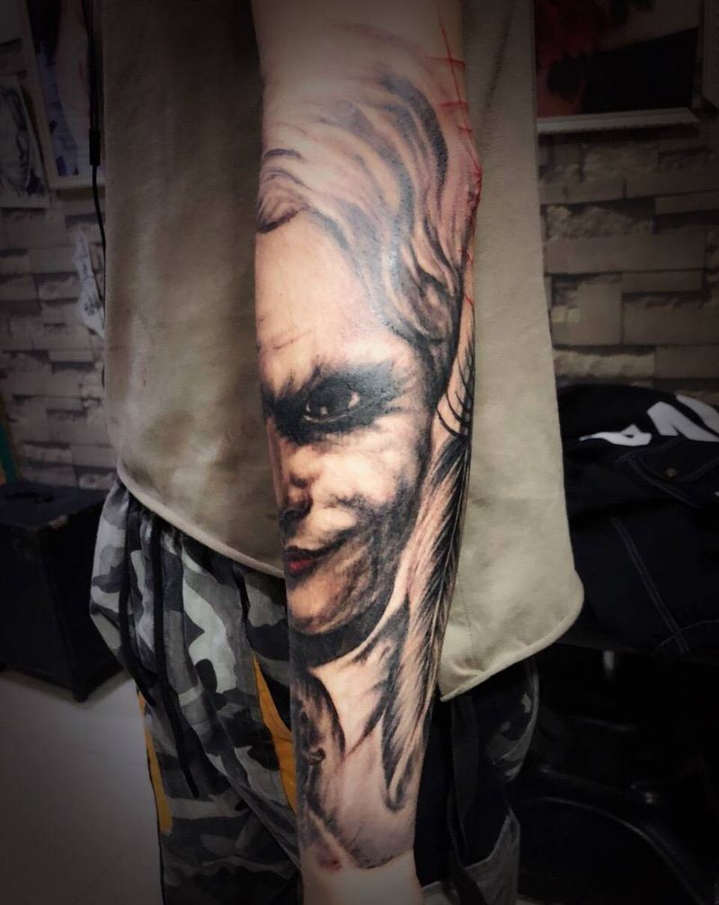 当前位置: 首页 >江苏省无锡市纹身店-无锡龙舞刺青纹身工作室纹身图案>小丑-希斯.莱杰纹身图片_手臂欧美写实纹身图案