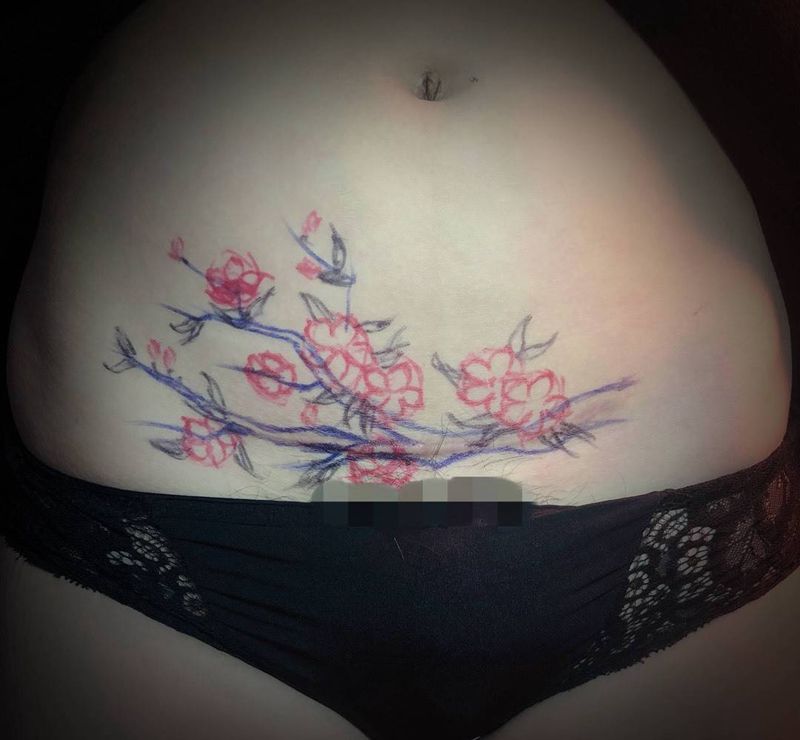 遮盖剖腹产手术疤痕纹身图片_腹部纹身图案