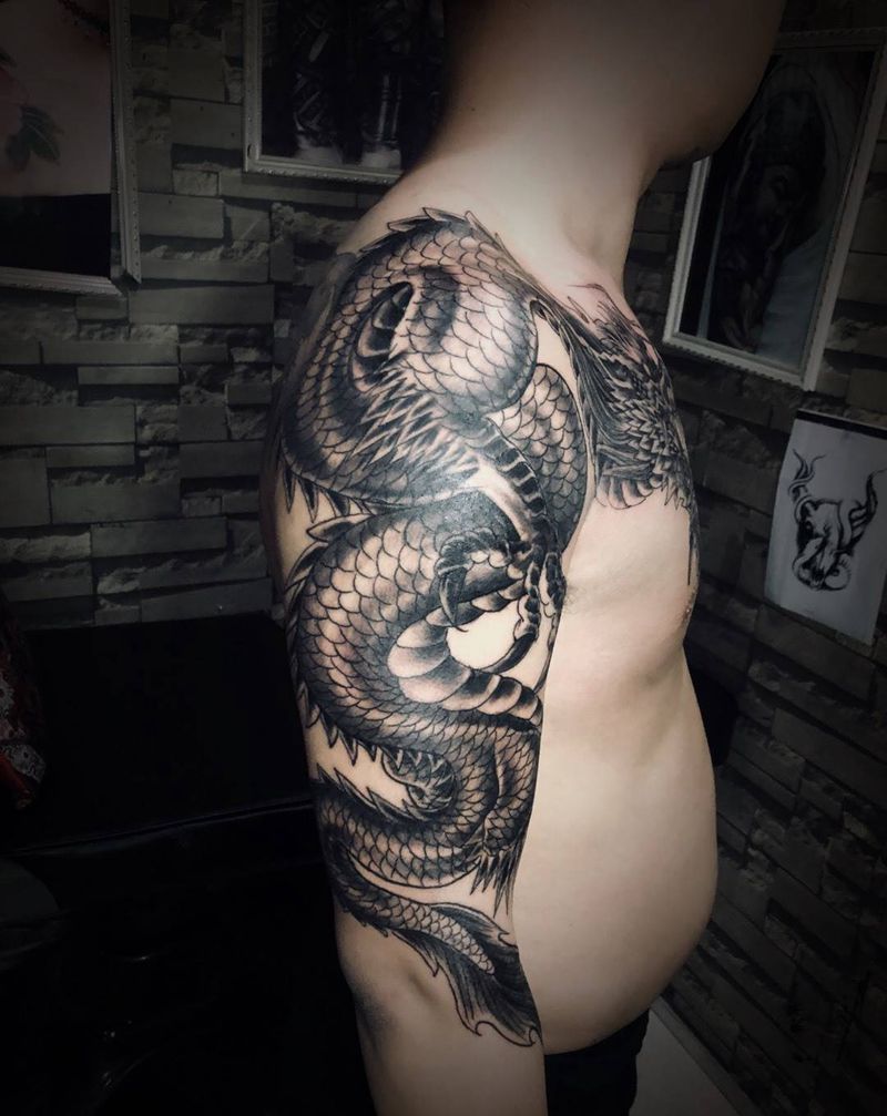 当前位置: 首页 >江苏省无锡市纹身店-无锡龙舞刺青纹身工作室纹身图案>披肩龙纹身图片_手臂新传统纹身图案