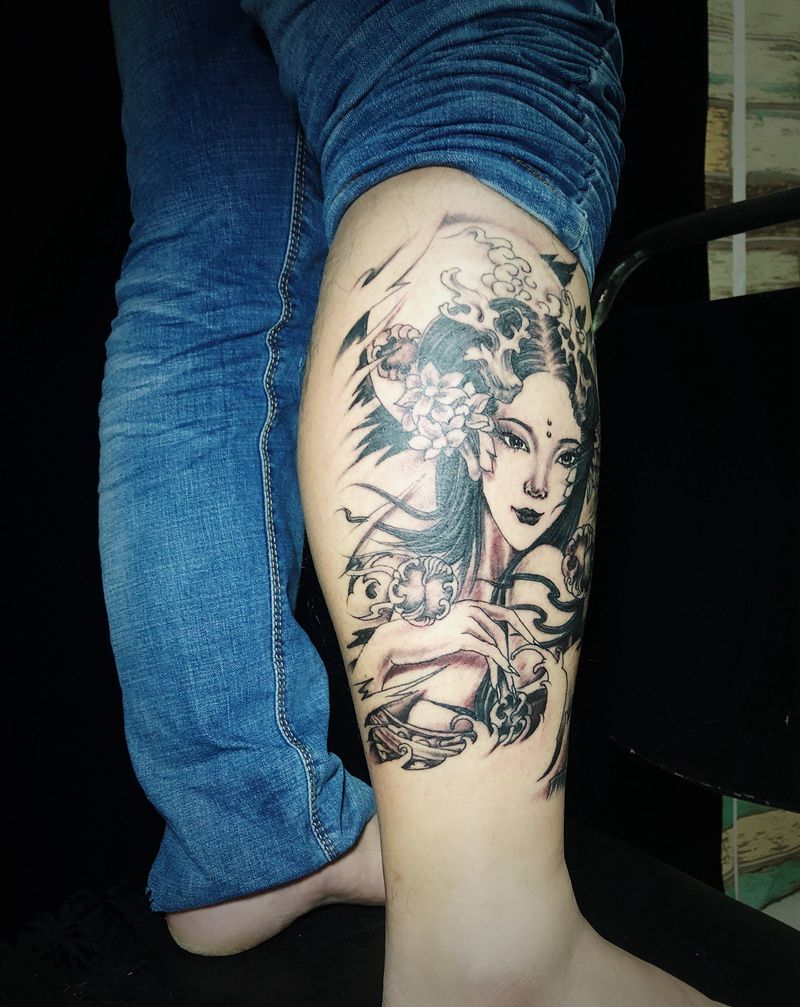 • T网红王老大花腿龙纹身图片_腿部新传统纹身图案