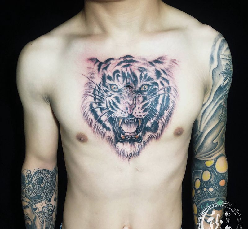 当前位置: 首页 >江苏省无锡市纹身店-无锡龙舞刺青纹身工作室纹身图案>虎王遮盖疤痕纹身图片_胸部纹身图案