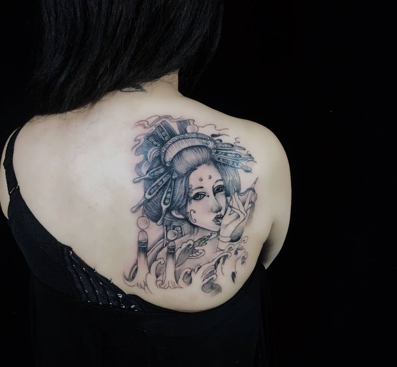 当前位置: 首页 >江苏省无锡市纹身店-无锡龙舞刺青纹身工作室纹身图案>艺妓纹身图片_背部纹身图案