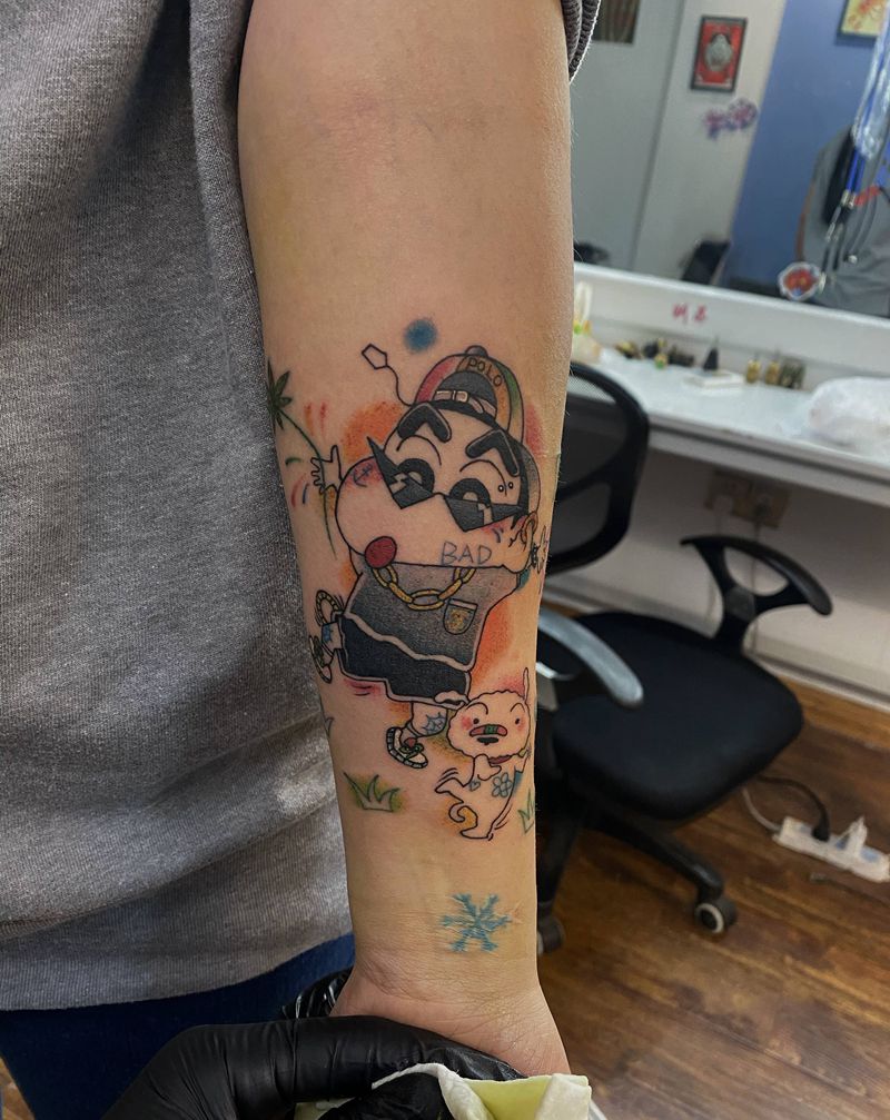 当前位置: 首页 >江苏省无锡市纹身店-浪客纹身工作室纹身图案>蜡笔小新纹身图片_手臂纹身图案