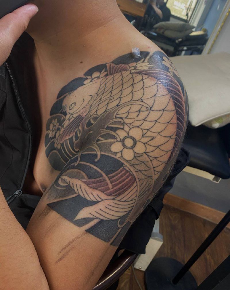 当前位置: 首页 >江苏省无锡市纹身店-浪客纹身工作室纹身图案>鲤鱼樱花纹身纹身图片_背部老传统纹身图案