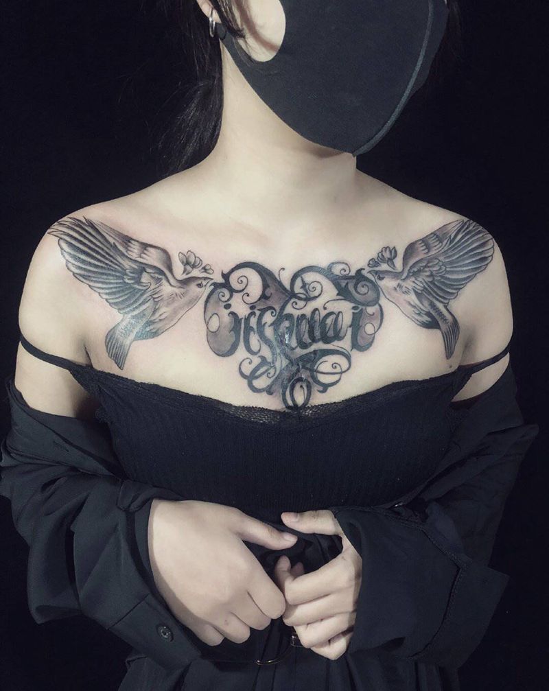坚强的妹纸纹身图片_胸部花体字纹身图案