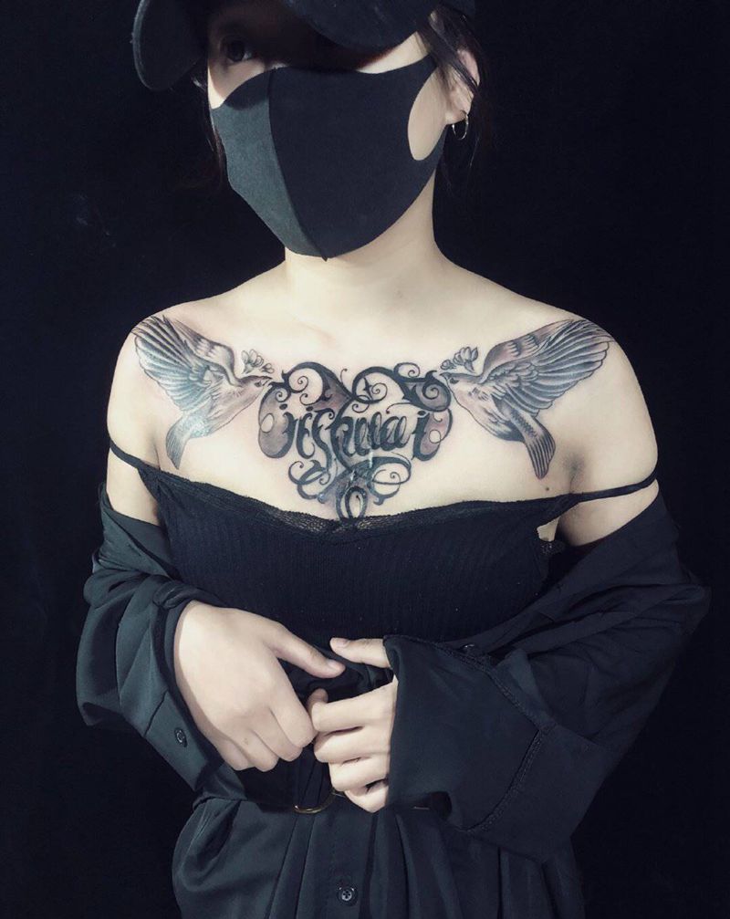 坚强的妹纸纹身图片_胸部花体字纹身图案