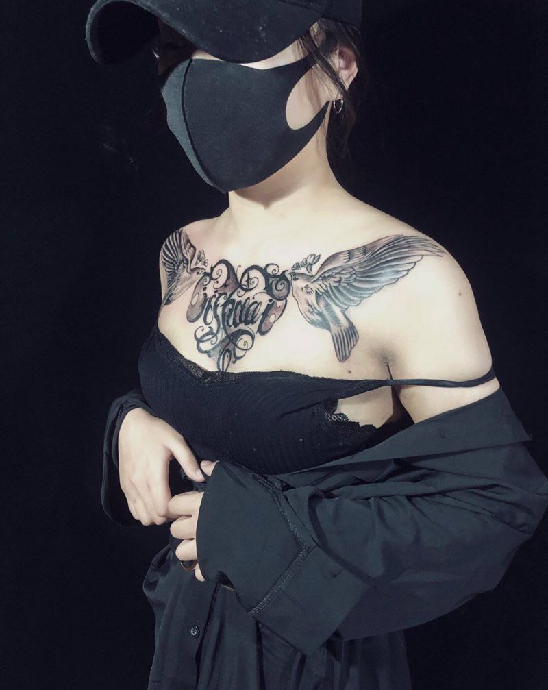坚强的妹纸纹身图片_胸部花体字纹身图案