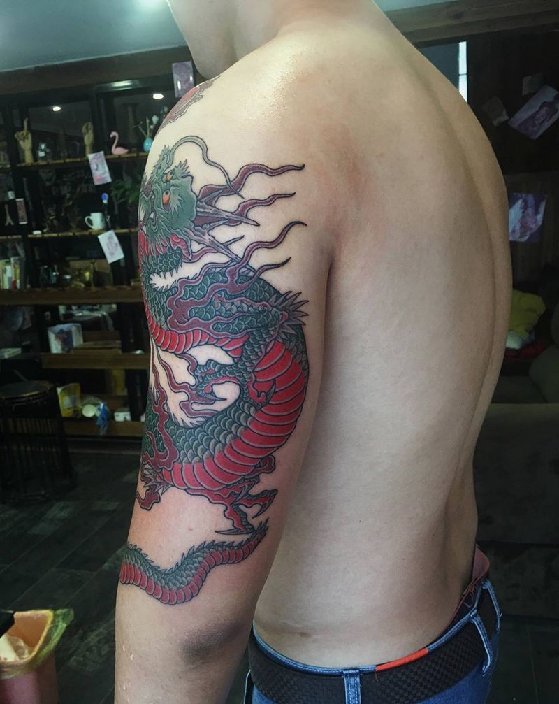 • T网红王老大花腿龙纹身图片_腿部新传统纹身图案