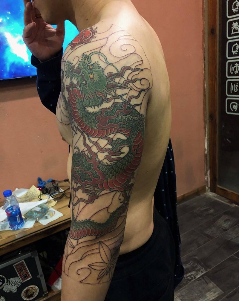 • T网红王老大花腿龙纹身图片_腿部新传统纹身图案