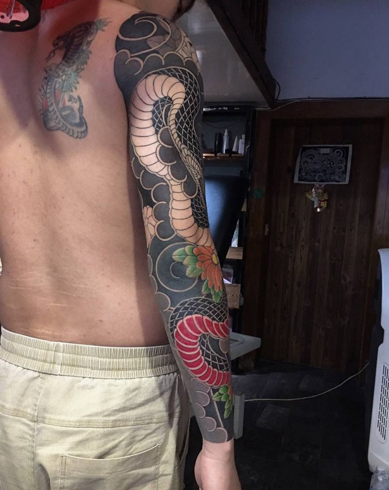 当前位置: 首页 >江苏省无锡市纹身店-浪客纹身工作室纹身图案>蛇菊花臂纹身图片