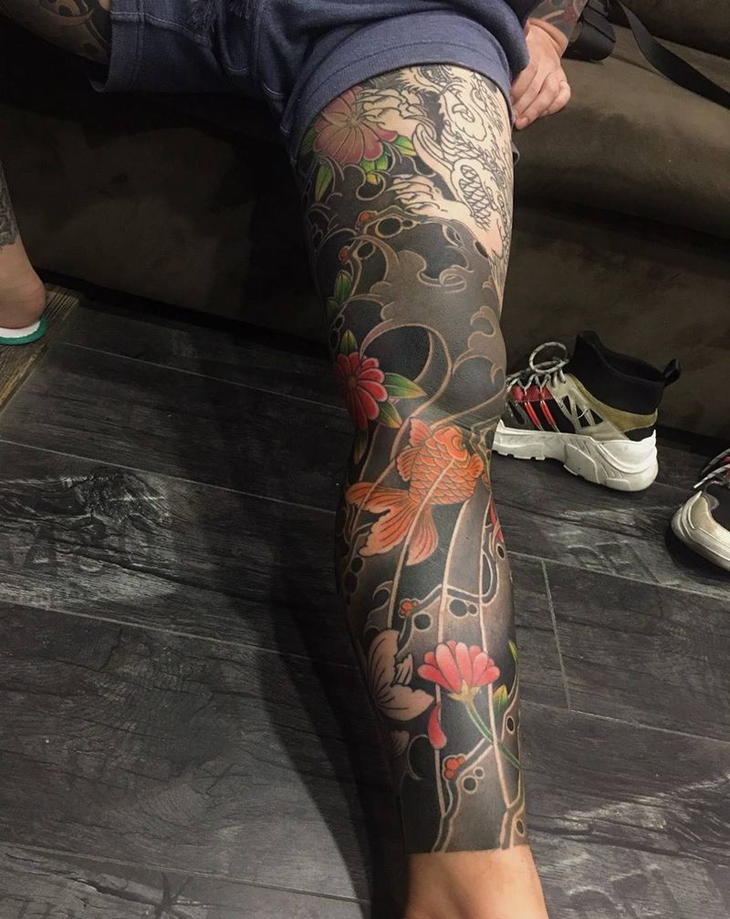 • T网红王老大花腿龙纹身图片_腿部新传统纹身图案