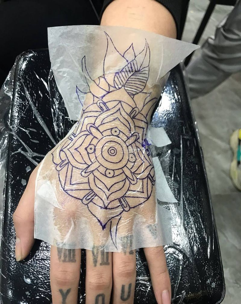 • 手背潮流时尚的玫瑰花眼睛纹身图案