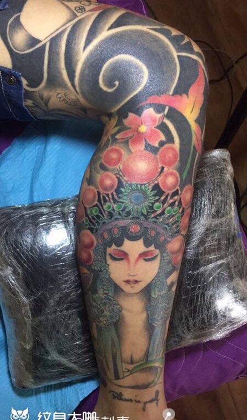 当前位置: 首页 >江苏省徐州市纹身店-徐州龍刺青文艺工作室纹身图案>小腿花旦纹身图片_成品腿部传统人物纹身图案