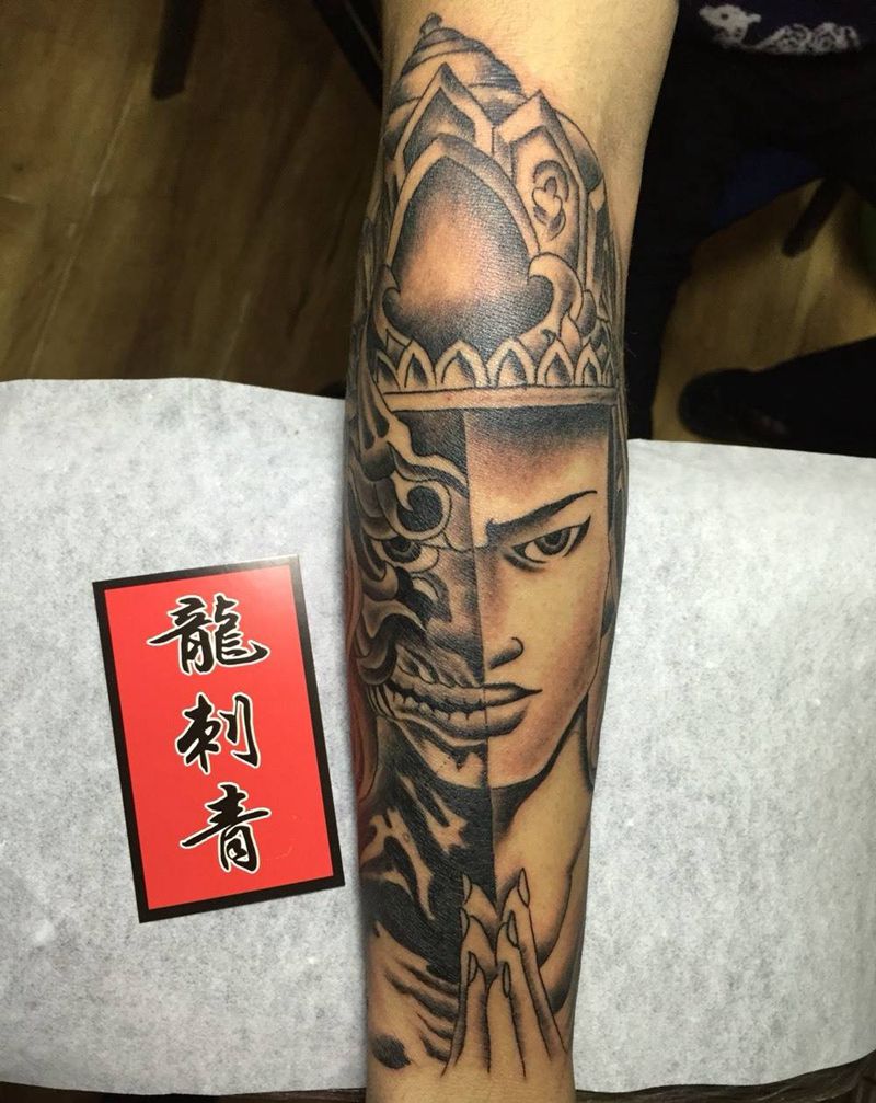 当前位置: 首页 >江苏省徐州市纹身店-徐州龍刺青文艺工作室纹身图案>一念之间纹身图片_成品手臂传统鬼神纹身图案