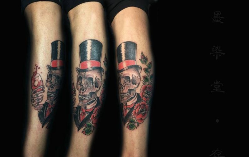 • T包小腿吹火男+阿多福纹身图片_腿部老传统新传统吹火男阿