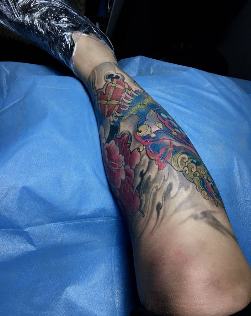 • T网红王老大花腿龙纹身图片_腿部新传统纹身图案