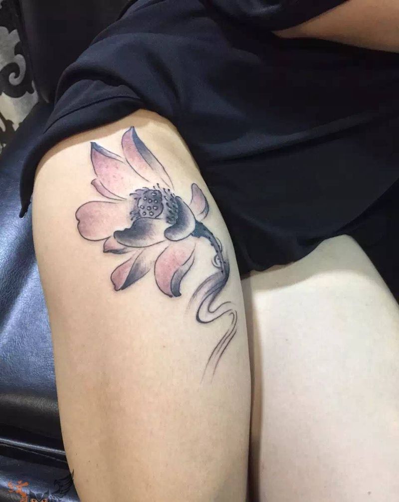 水墨莲花纹身图片_无锡.宜兴雨墨刺青常州腿部植物国画传统原创纹身图案