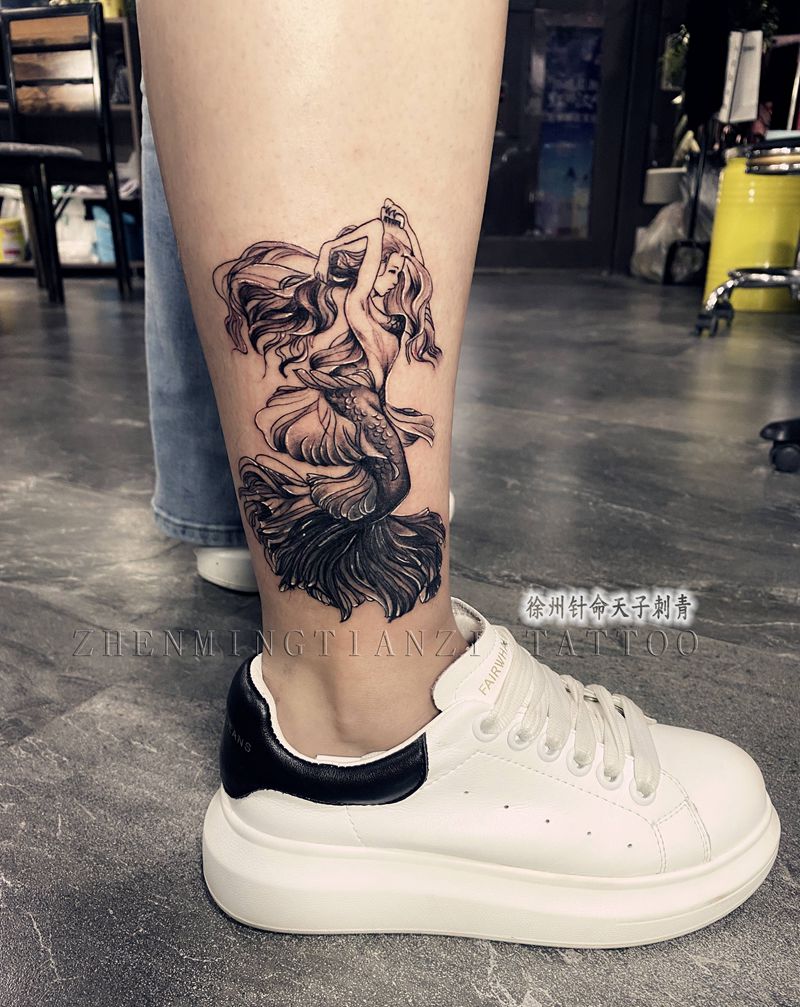 美人鱼遮盖纹身图片_腿部水墨几何纹身图案