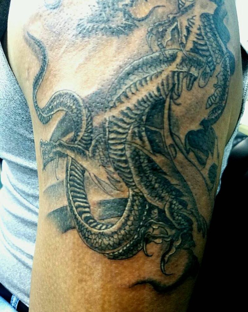 当前位置: 首页 >江苏省徐州市纹身店-针命天子·刺青纹身图案>老外就要纹中国的传统龙 皮肤黑纹身图片