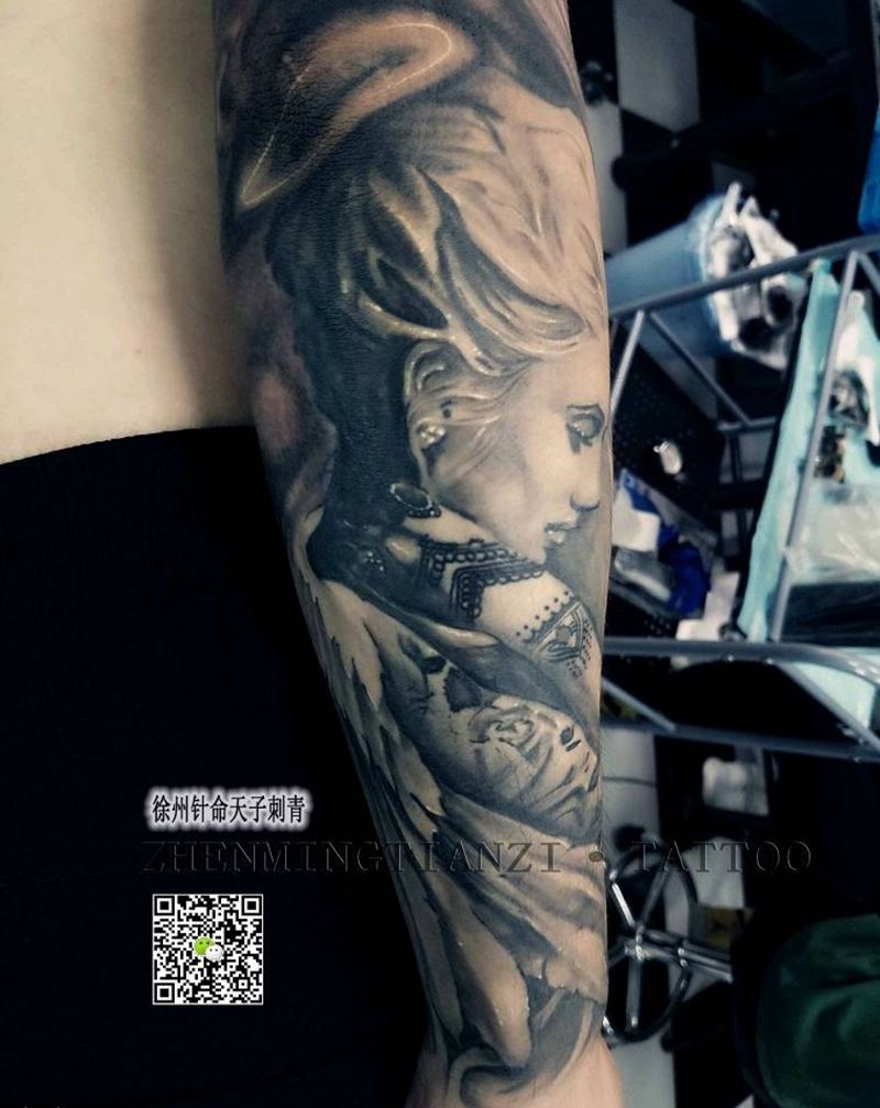 欧美黑灰写实花臂完工纹身图片