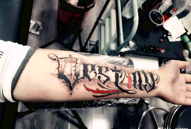 当前位置: 首页 >江苏省徐州市纹身店-针命天子·刺青纹身图案>花体字纹身图片_手臂花体字纹身图案