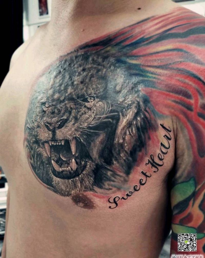 狮子和字母纹身图片_胸部欧美写实纹身图案