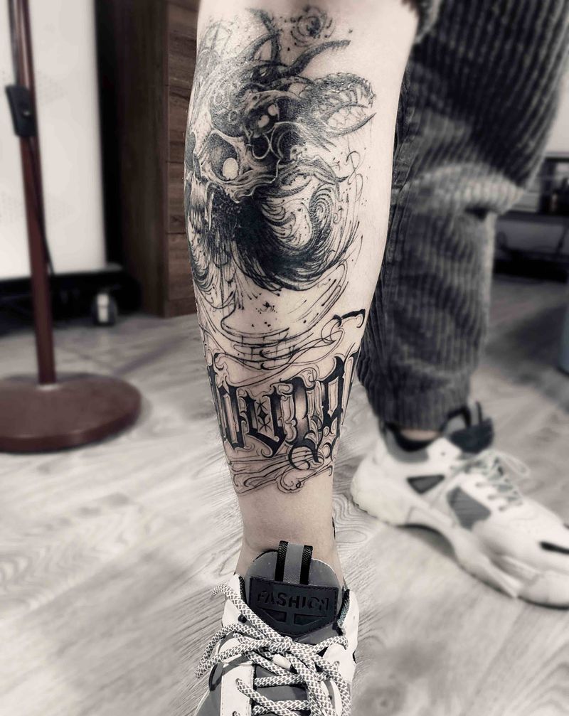 当前位置: 首页 >江苏省徐州市纹身店-针命天子·刺青纹身图案>暗黑系 拼接 遮盖纹身图片_腿部花体字纹身图案