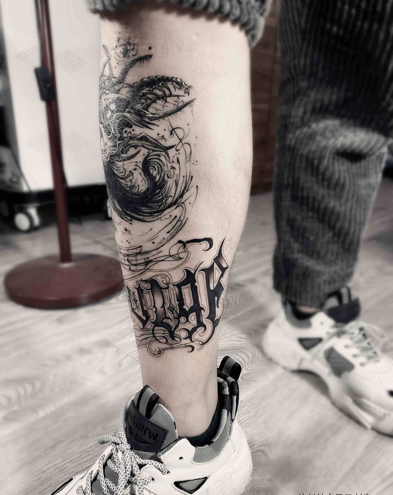 暗黑系 拼接 遮盖纹身图片_腿部花体字纹身图案