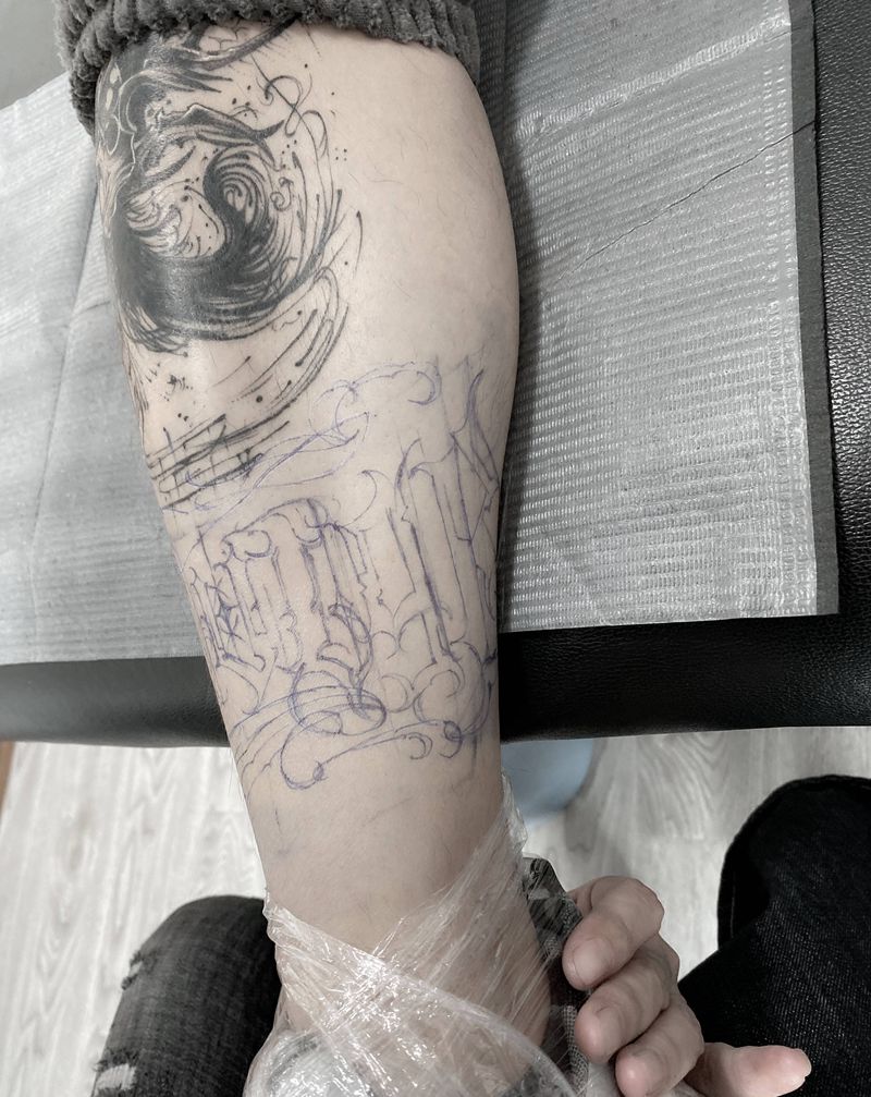 当前位置: 首页 >江苏省徐州市纹身店-针命天子·刺青纹身图案>暗黑系 拼接 遮盖纹身图片_腿部花体字纹身图案