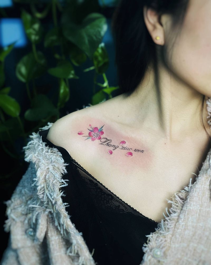 小清新纹身图片_胸部颈部点刺花体字樱花 字母纹身图案